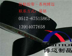 防粘胶带反面涂有特殊的压敏型胶粘剂,能将胶带牢牢地粘附在一般材料上,包括难粘的硅橡胶。防粘胶带主要用在涂布机轮转、印刷机、印染机等传动辊上。通常这些设备的某些传动辊需要接触涂胶面、印刷面或印染面。未干燥的印刷面和印染面易沾污辊筒而影响产品的表面图案。而涂布压敏胶的涂布机接触胶面传动辊一般采用金属表面拉毛刺接触点小而防止胶面粘住;或大多采用表面包覆硅橡胶来解决防粘问题。