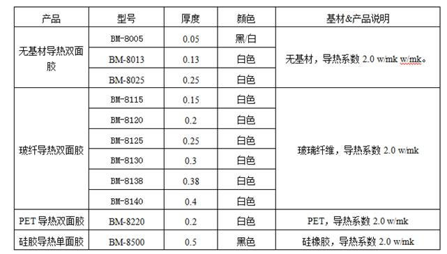 由压克力聚合物或玻璃纤维为基材制成的导热双面胶带。兼具高导热,低释气,抗老化,绝缘性优,粘性高等特点。具有极高的机械强度,能提高表面浸湿率和有做优异的减震性能特征。应用于要求具有良好传热的薄粘接层:粘接在散热器或其他冷却装置上的零件,柔性电路和电力变压器,在固定散热片于晶片组,或软板上,导热胶带具有立即粘贴性,绝缘性,低释气性和高热传导性。