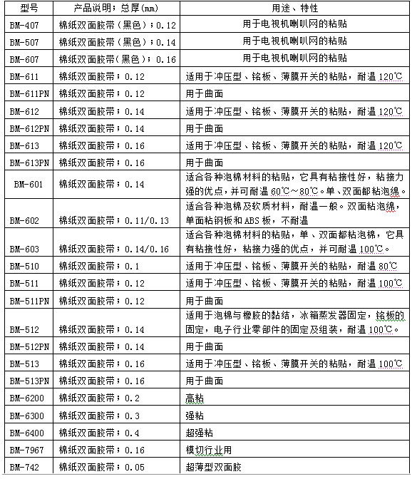 无纺布双面胶带(棉纸双面胶):由无纺布双面涂布丙希酸胶制成,对金属及塑料件具有良好的粘性,具有优良的耐热性;短期耐温性120℃,长期耐温性150℃;初粘性、持粘性好;易模切加工。主要应用于汽车、家电电器、电脑、通讯设备中的金属和塑料标牌、面板等粘接,而且持粘性好。具有抗反弹、翘曲、耐热、耐温性佳,同时还具有较强的粘接力和持粘力,对多种基材有较佳之粘合力,方便易撕,使用干净,厚度从0.1mm-0.4mm,可以替代3m、tesa等进口同类产品。
